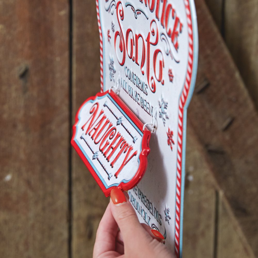 FLAWED: This cute sign came in with a flaw and we are unable to sell at full price. Which means you get it for its lowest possible price. The sign only flips up to say nice, but otherwise it is super cute and would be a fun addition to your holiday decor.