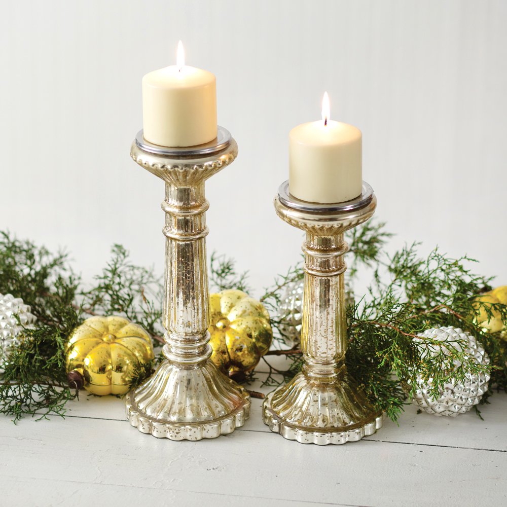Set of Two Mercury Glass Pillar Candle Holders Set of Two Mercury Glass Pillar Candle Holders